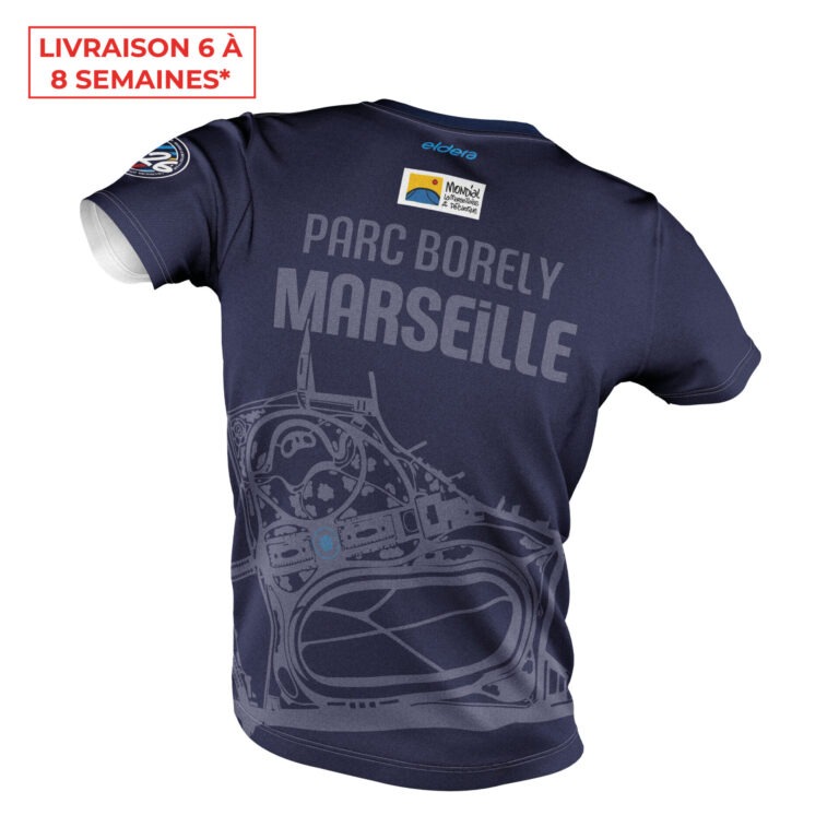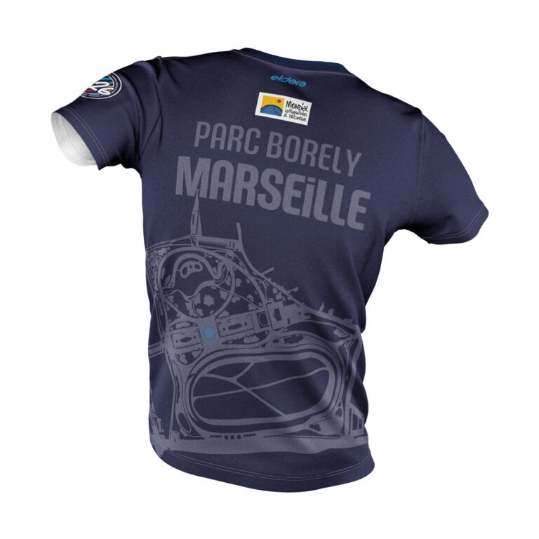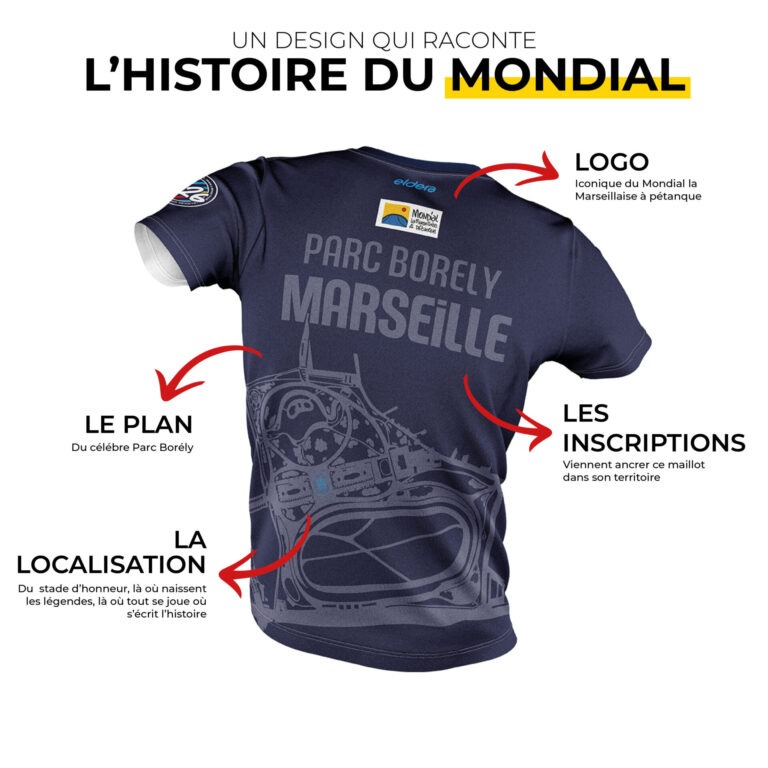 Au dos du maillot, l’identité du Mondial s’affirme pleinement avec : le logo iconique du Mondial La Marseillaise à Pétanque ; une illustration du Parc Borély, lieu historique du tournoi ; la localisation du stade d’honneur, là où se jouent les finales et où naissent les légendes ; les inscriptions « Marseille » et « Parc Borély » viennent ancrer ce maillot dans le territoire et l’histoire de la compétition.