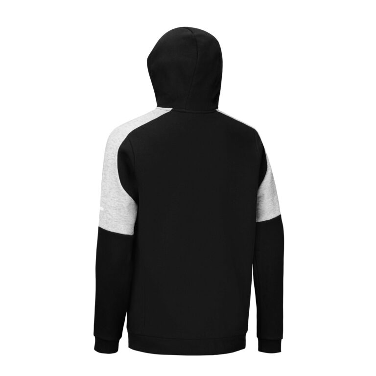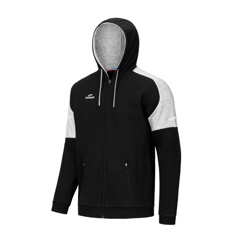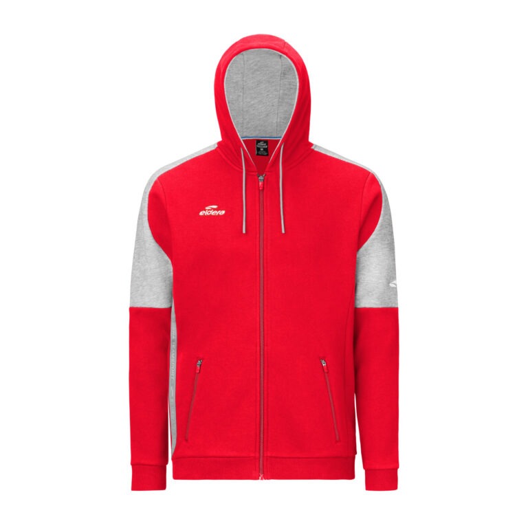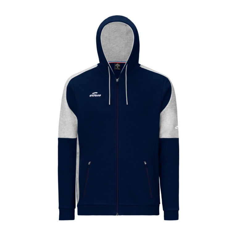 Veste en molleton bi-matière coton et polyester pour un confort total. Intérieur du sweat gratté, apportant douceur et toucher duveteux. Empiècements sur le haut des épaules et le long des bras en gris chiné. Intérieur de la capuche en coloris opposé. Possibilité de serrage du col à l’aide d’un cordon. Poches avant zippées. Ruban personnalisé Eldera sur la partie latérale droite du sweat. Finition des manches et de la ceinture en bords-côtes. Logos brodés. Bande de propreté tricolore à l’intérieur du col. Composition 52% coton et 48% polyester.